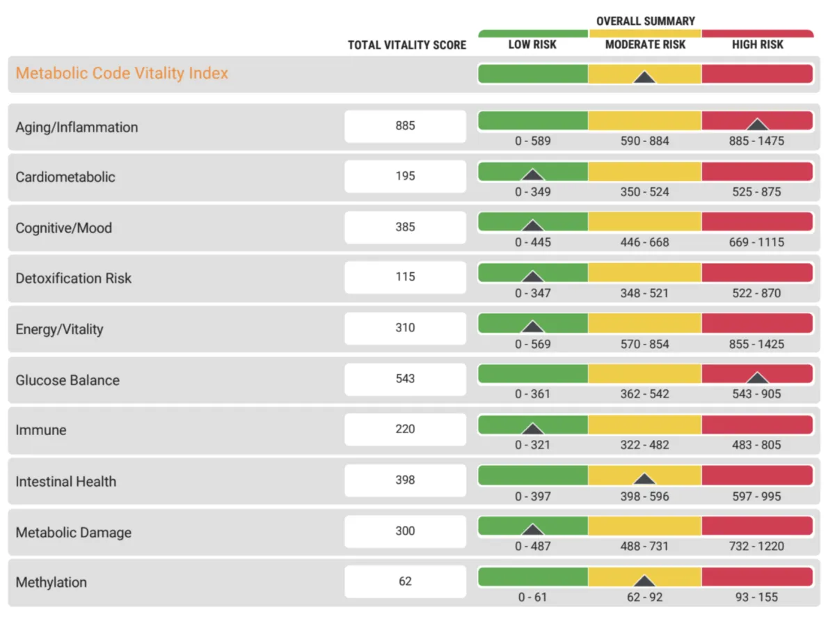Your Metabolic Code Vitality Index is the total value of how optimized your body chemistry is performing. Your metabolism is more than just